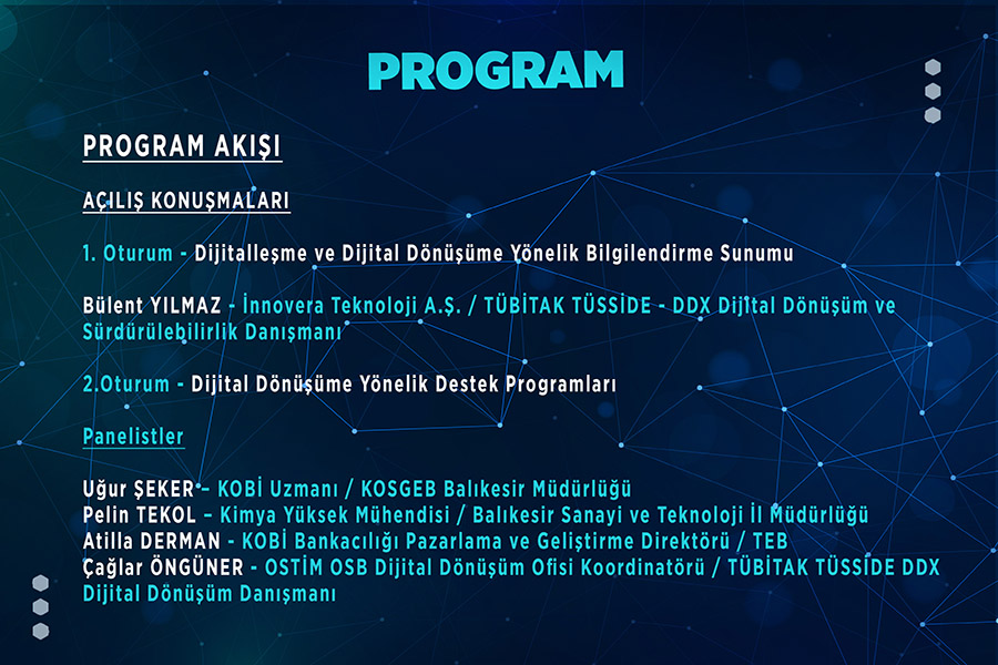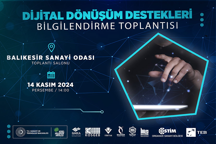 Bilgilendirme toplantısı GMKA koordinasyonunda ve Balıkesir Sanayi Odası ev sahipliğinde, Balıkesir Ticaret Odası, Balıkesir Sanayi ve Teknoloji İl Müdürlüğü, KOSGEB Balıkesir Müdürlüğü, Balıkesir Organize Sanayi Bölgesi Müdürlüğü, OSTİM OSB, TÜBİTAK TÜSSİDE ve Türk Ekonomi Bankası iş birliğiyle gerçekleştirilecek olup iki kısımdan oluşacaktır. Bilgilendirme toplantısının ilk kısmında dijitalleşme ve dijital dönüşüm alanında teorik ve teknik bilgiler aktarılacak; ikinci kısımda ise dijital dönüşüme yönelik teşvikler ve olanaklar hakkında panel gerçekleştirilecektir.