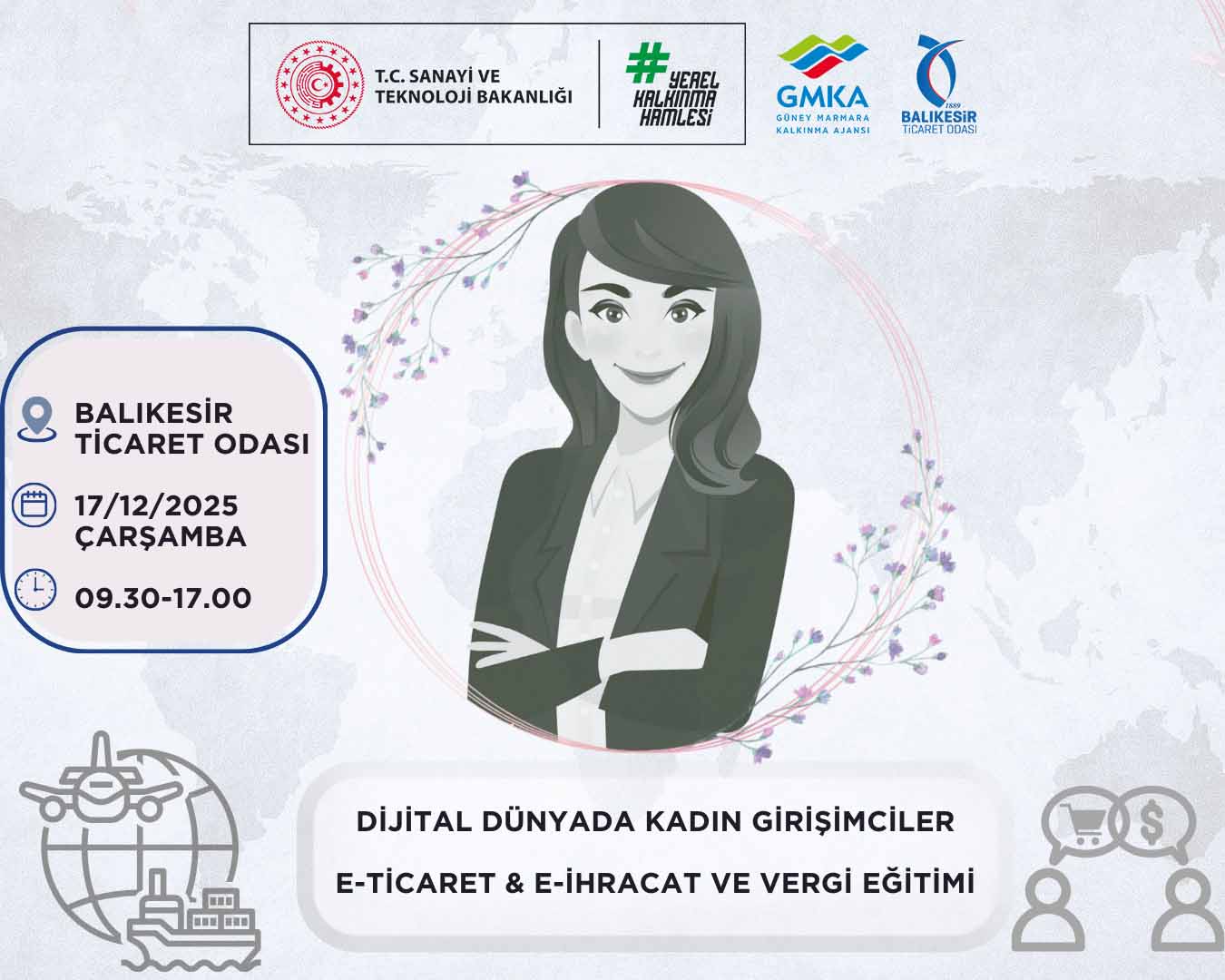 Kadın girişimciliğini desteklemek amacıyla, Ajansımız ile Balıkesir Ticaret Odası işbirliği ile gerçekleştirilecek olan eğitim 17 Aralık 2025 Çarşamba günü Balıkesir Ticaret Odasında gerçekleştirilecek. Kadınlara yönelik bu özel programda, dijital pazarlarda yer almak isteyen girişimciler için hem iç hem dış pazarda satış yapmanın yolları detaylı şekilde ele alınacak.