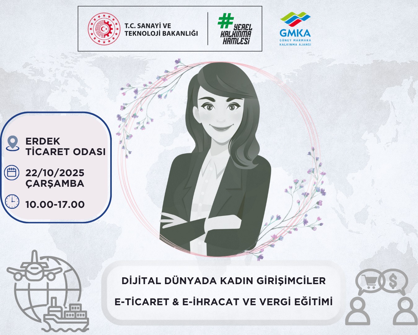Kadın girişimciliğini desteklemek amacıyla, Ajansımız ile Erdek Ticaret Odası işbirliği ile gerçekleştirilecek olan eğitim 22 Ekim 2025 Çarşamba günü Erdek Ticaret Odasında gerçekleştirilecek. Kadınlara yönelik bu özel programda, dijital pazarlarda yer almak isteyen girişimciler için hem iç hem dış pazarda satış yapmanın yolları detaylı şekilde ele alınacak.