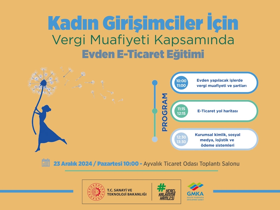 Evde ürün üreterek e-ticaret yoluyla satmak ve bu şekilde gelir elde etmek isteyen kadınlarımız için Ayvalık Ticaret Odasının iş birliğinde Güney Marmara Kalkınma Ajansı (GMKA) tarafından “Kadınlar için Vergi Muafiyeti Kapsamında Evden E-Ticaret Eğitimi” verilecektir.