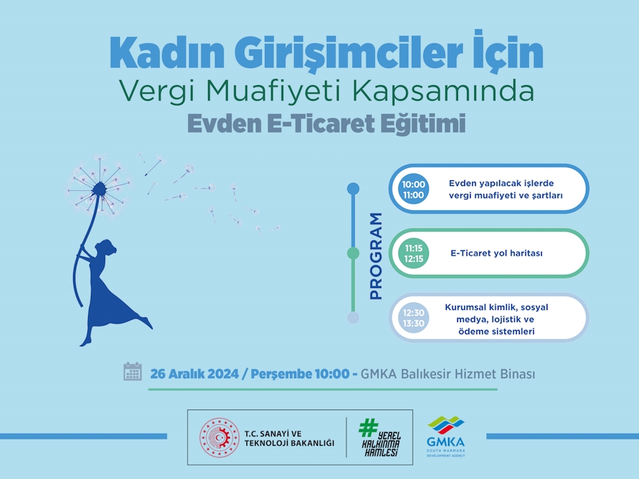 Evde ürün üreterek e-ticaret yoluyla satmak ve bu şekilde gelir elde etmek isteyen kadınlarımız için Güney Marmara Kalkınma Ajansı (GMKA) tarafından “Kadınlar için Vergi Muafiyeti Kapsamında Evden E-Ticaret Eğitimi” verilecektir.
