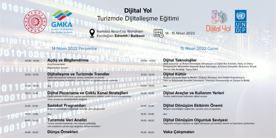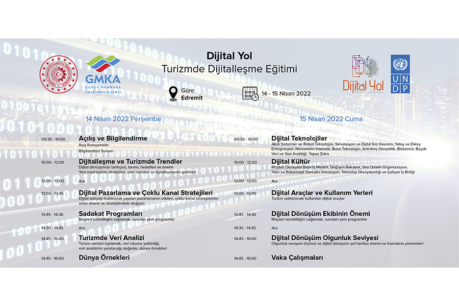 Güney Marmara Kalkınma Ajansı (GMKA), projenin pilot Ajansları arasında yer almaktadır. Proje kapsamında, Balıkesir ve Çanakkale’deki “Kültür ve Turizm Bakanlığı Belgeli Konaklama Tesisleri arasında bulunan” KOBİ’lere yönelik “dijitalleşme ve dijital dönüşüm” odaklı eğitim düzenlenecektir. Eğitim, 14-15 Nisan 2022 tarihleri arasında, Edremit İlçesi’nin Güre Beldesi’nde 2 gün olacak biçimde gerçekleştirilecektir.