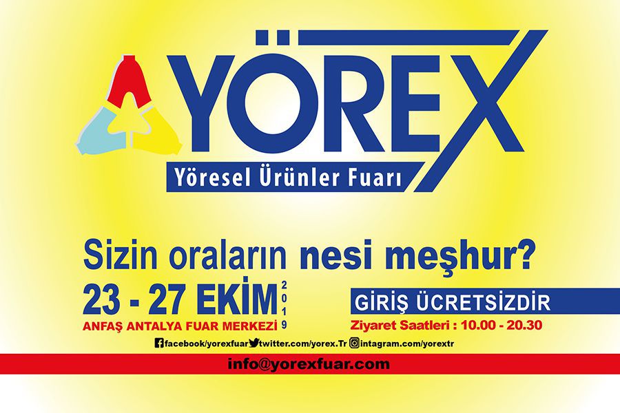 Yöresel ürünlerin; Ticarete kazandırılması, tüketilmesinin yaygınlaştırılması, katma değerleinin artılıması ve coğrafi işaret ile tescil ettirilerek standartlarının oluşturulması gibi amaçlarla bu yıl onuncusunu düzenlenecek olan YÖREX – Yöresel Ürünler Fuarı, 23-27 Ekim 2019 tarihlerinde ANFAŞ/Antalya Fuar ve Kongre Merkezi’nde gerçekleştirilecektir.